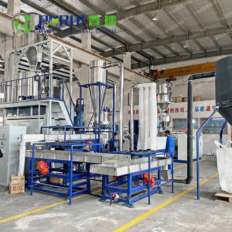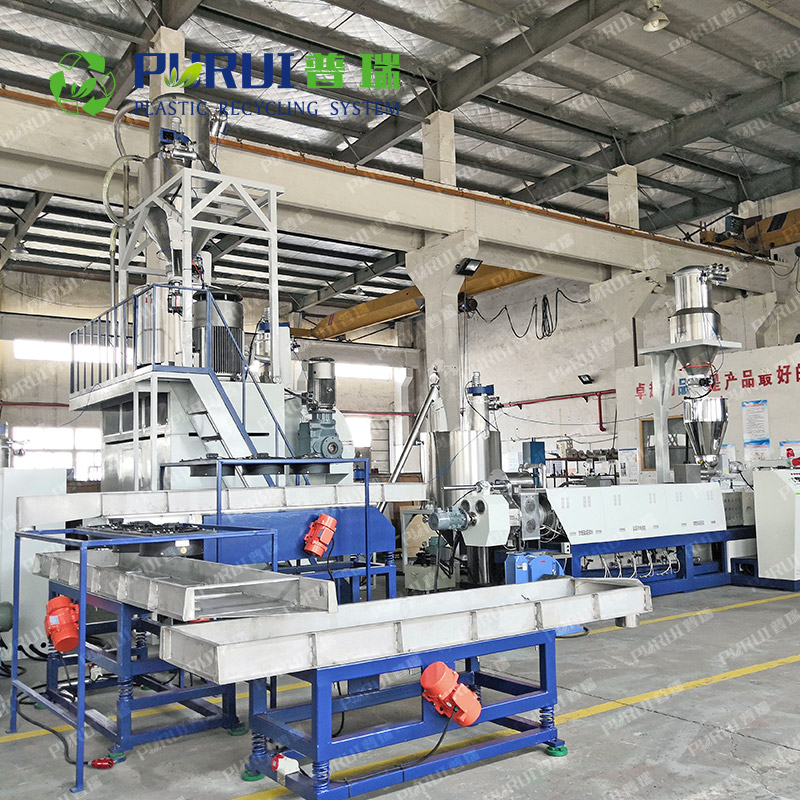 普瑞機械研發(fā)制造的PVC造粒機適用于PVC電纜、PVC管材、PVC薄膜、PVC雨棚布等塑料進行回收造粒再利用,使其廢塑料可再生循環(huán)。PVC造粒設(shè)備一般采用錐形雙螺桿擠出機或者單螺桿塑料造粒機進行擠出造粒,采用風(fēng)冷磨面切粒系統(tǒng),其后鏈接風(fēng)送、振動篩。